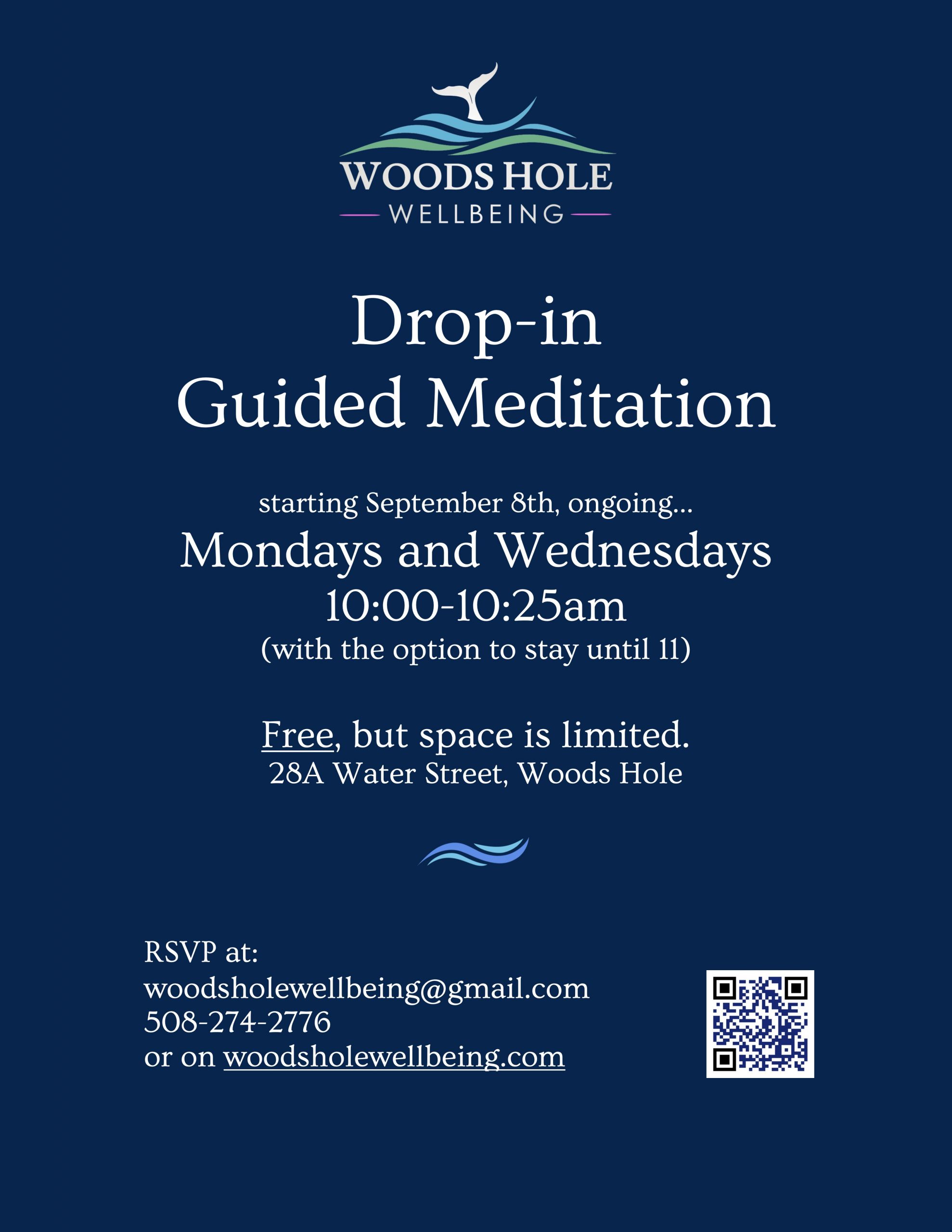 Every Monday and Wednesday, ongoing, Woods Hole Wellbeing is providing guided meditation from 10:00-10:25am, with the option to stay until 11am. No experience necessary, all are welcome. Stop in for an easy 25-min break to nurture yourself and open possibilities, or stay longer if you'd like. Each meditation is shaped for the people who show ...
